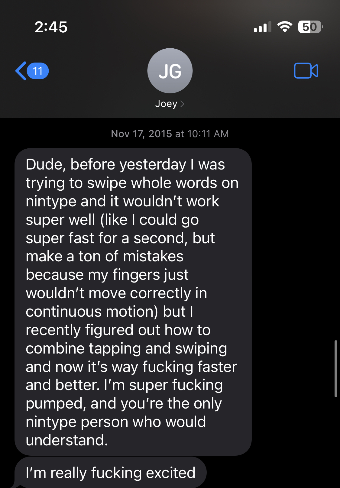 "the true touch typing experience"Essentially, Nintype is a keyboard that enables you to swipe and tap with both hands at the same time. If you're typing "there", you'd swipe the `th` with your right hand, and tap or swipe the `ere` with your left. It's such elegant and obvious next step for swipe keyboards it's incredible to me that no alternatives exist. It's really does feel like magic; see how my friend texted me when we were first discovering it (apologies for the expletives):